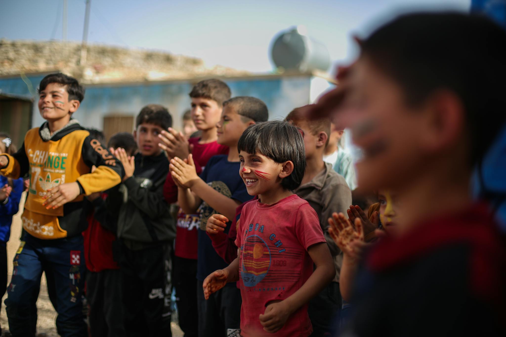 A group of children enjoy playing on a slide in Idlib, capturing joy amidst urban surroundings.
