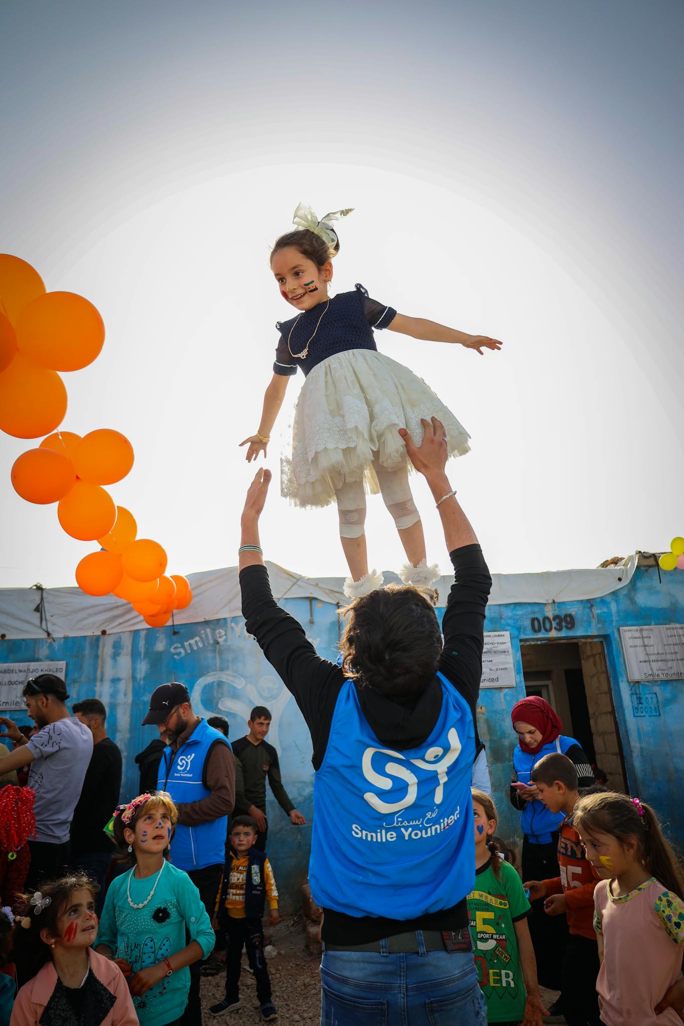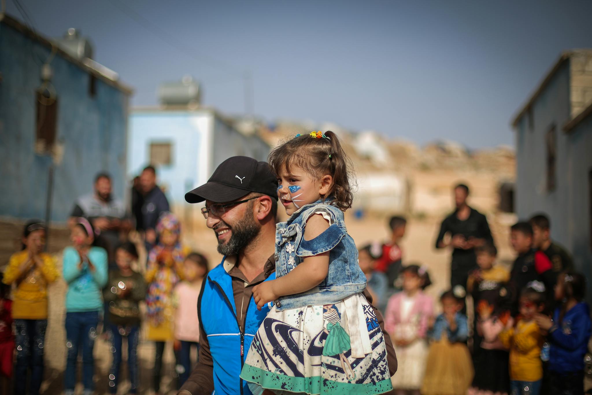 Happy elderly man enjoying a vibrant street festival in Idlib, Syria.